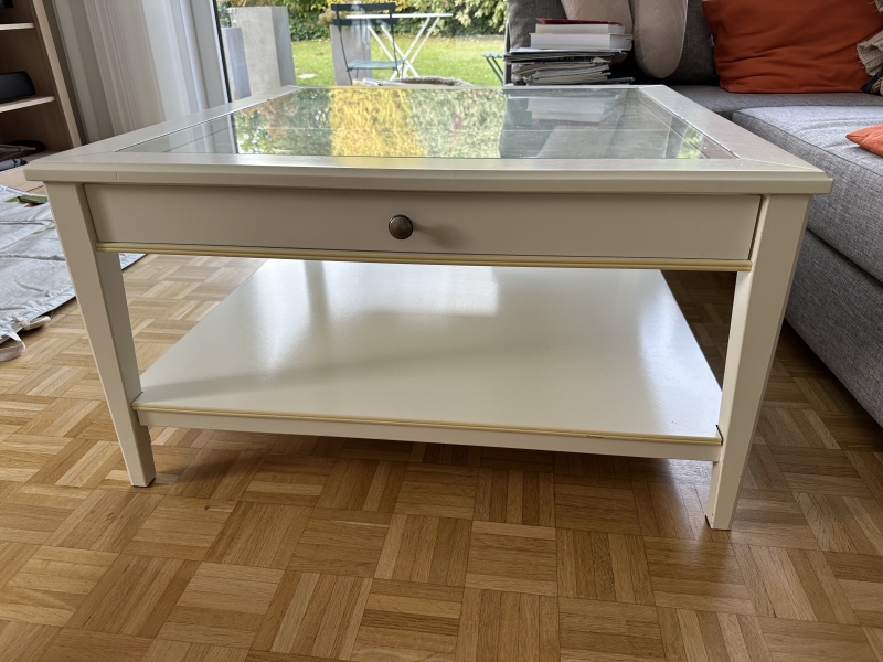 Table basse blanche Ikea avec tiroir a compartiments vitrés. État utilisée, a venir chercher non ...