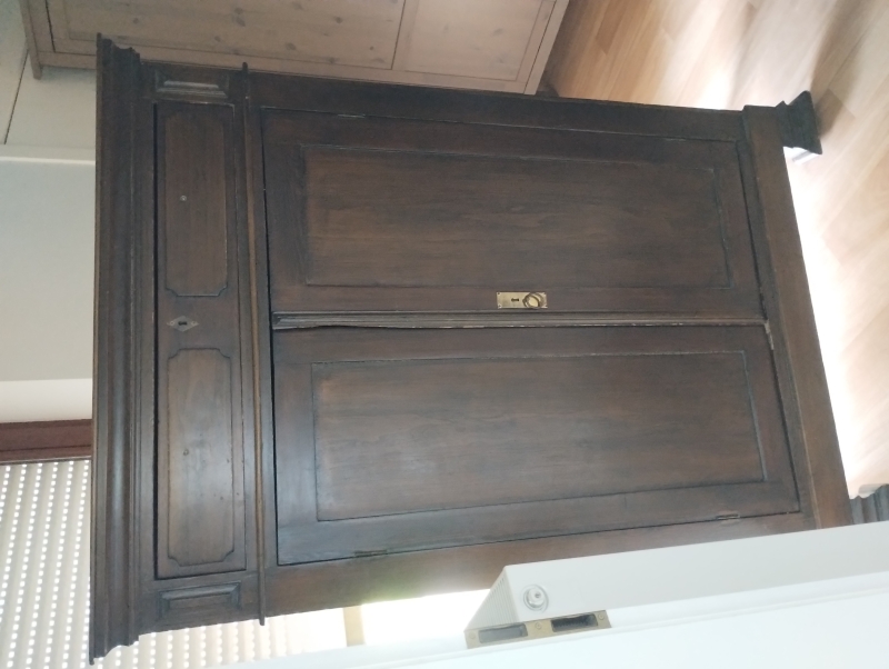 Meuble ancien qui a déjà eu plusieurs vies. Il y a des espaces entre les planches, un trou fait p...