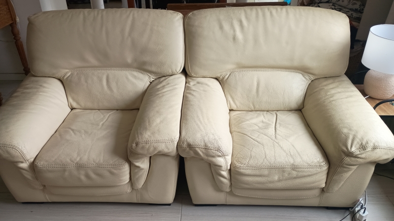 2 fauteuils 1 place beiges, état correct, l'assise est encore très bonne, accoudoir un peu usé su...
