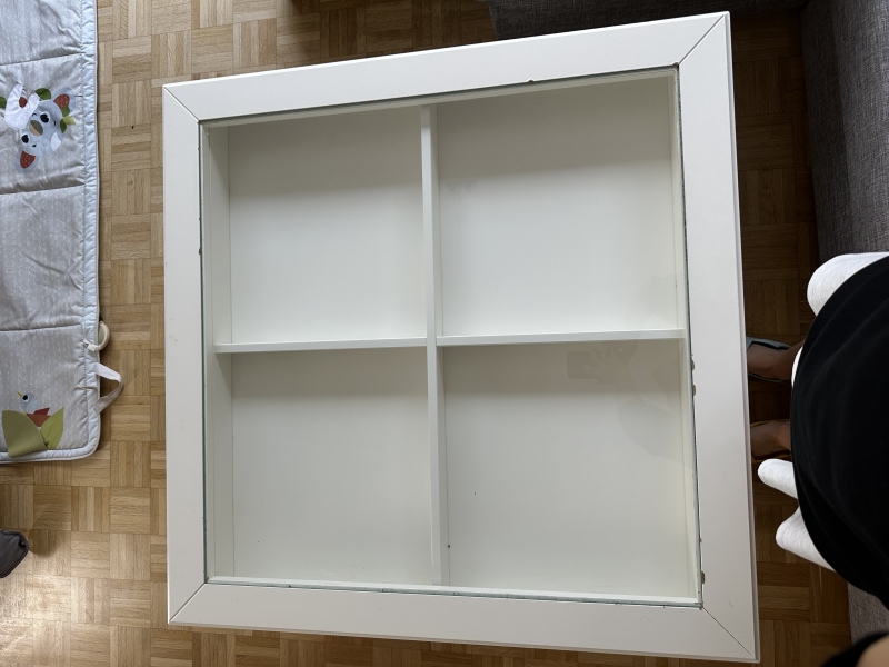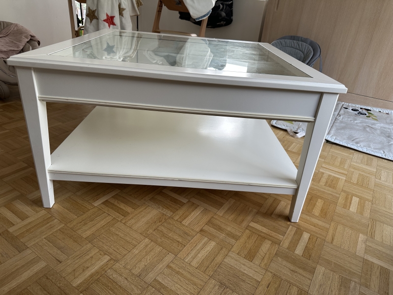 Table basse blanche Ikea avec tiroir a compartiments vitrés. État utilisée, a venir chercher non démontée à Bierges. Dimensions : 93 x 93 cm, 51cm hauteur. Mis en vente suite à réaménagement intérieur